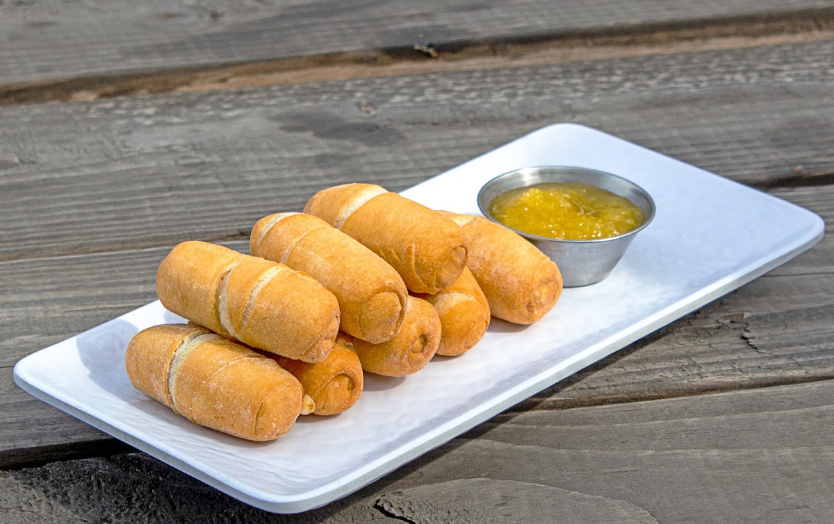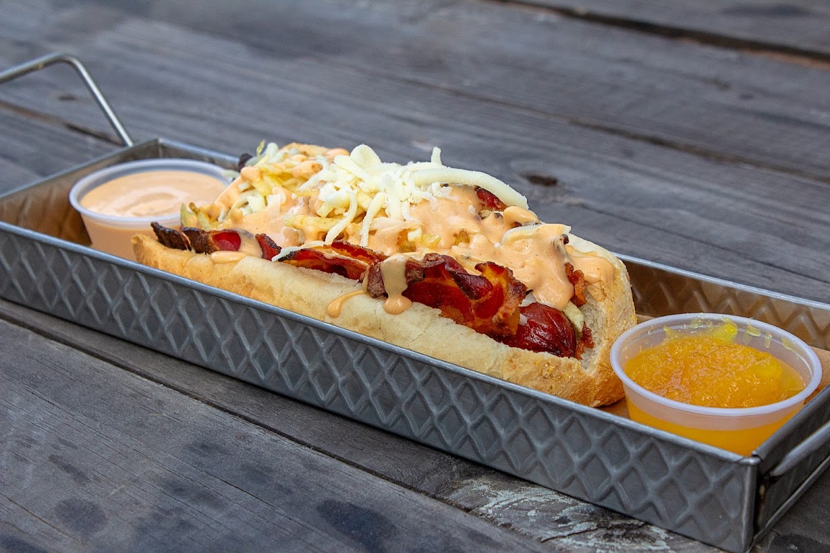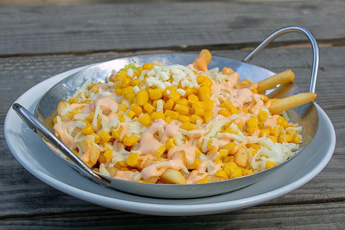 Colombian Sausage. Grilled Corn, Cheese, Pink Sauce, topped with Crunchy Potatoes. Served on a bed of Lettuce.